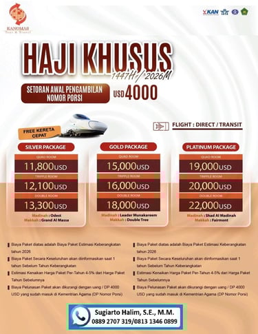 Haji plus, juga dikenal sebagai haji khusus, adalah ibadah haji yang diselenggarakan oleh Penyelenggara Ibadah Haji Khusus (PIHK) dengan menggunakan visa dari kuota haji yang telah ditetapkan oleh pemerintah. Jemaah haji plus mendapatkan fasilitas dan layanan yang lebih baik dibandingkan dengan haji reguler, dengan estimasi 6-9 tahun. kami bekerja sama dengan lembaga keuangan syariah (LKS) untuk memperoleh pembiayaan Porsi Haji Plus yang tentunya di awasi oleh Dewan Syariah Nasional (DSN), MUI, dan OJK.