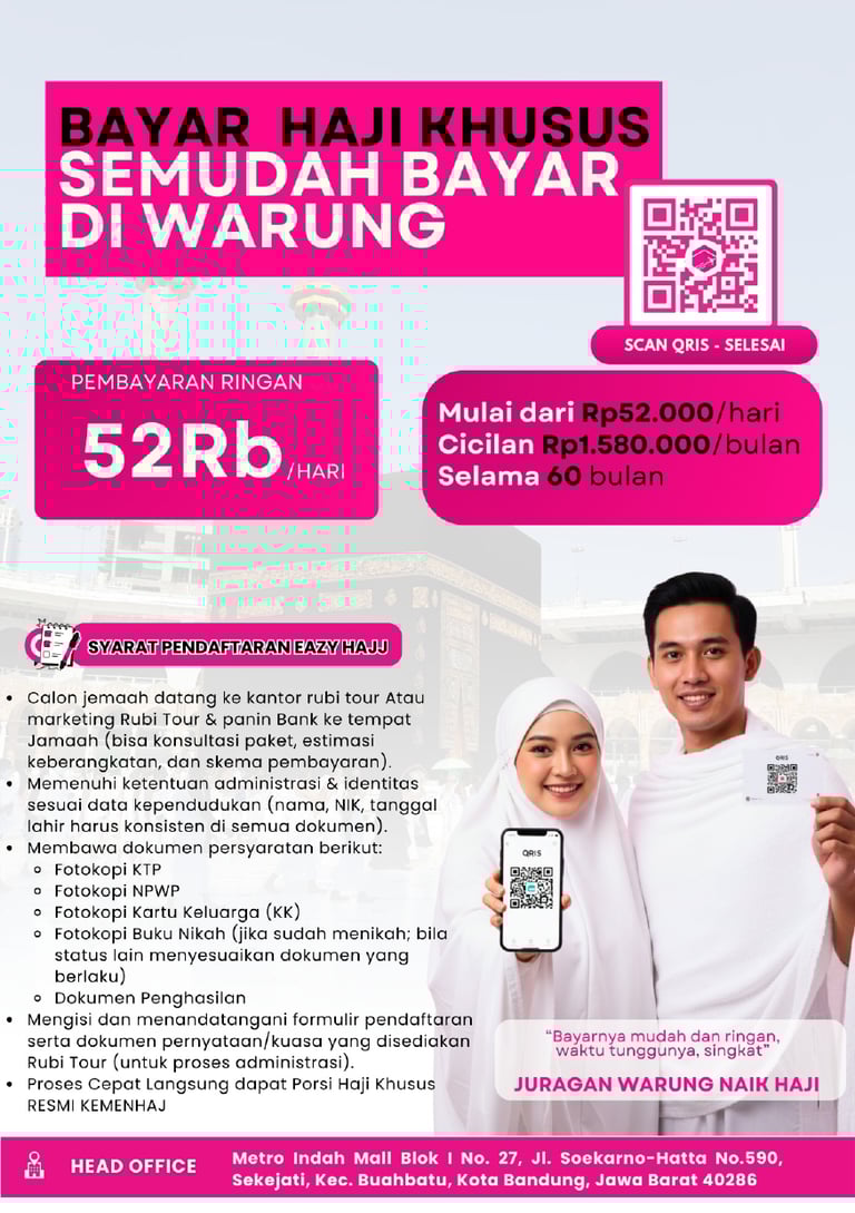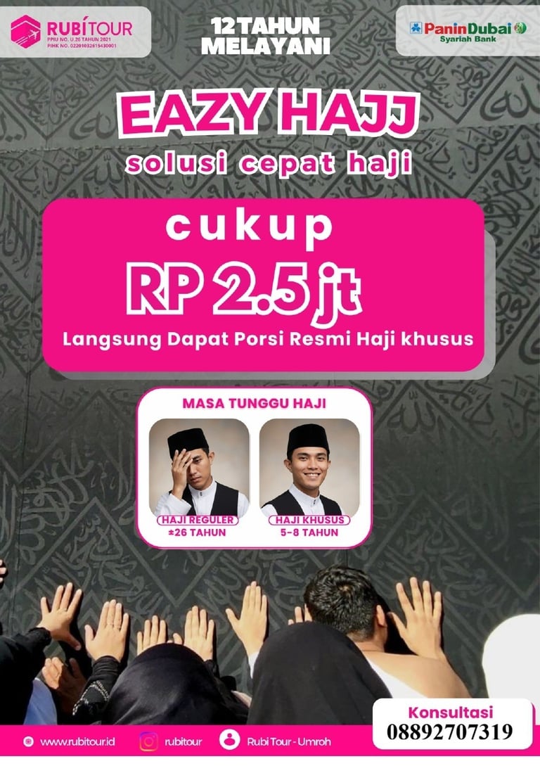 Eazy Hajj adalah Program Haji Plus Rubi Tour & Travel yang dirancang untuk membantu umat berhaji tanpa rasa takut. Mulai dari 52 rb per hari, kami bekerja sama dengan lembaga keuangan syariah (LKS) untuk memperoleh pembiayaan Porsi Haji Plus yang tentunya di awasi oleh Dewan Syariah Nasional (DSN), MUI, dan OJK.